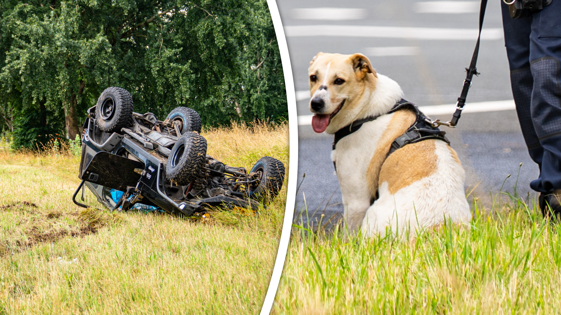 Auto over de kop op afrit, wonder boven wonder zijn bestuurder en hond ongedeerd