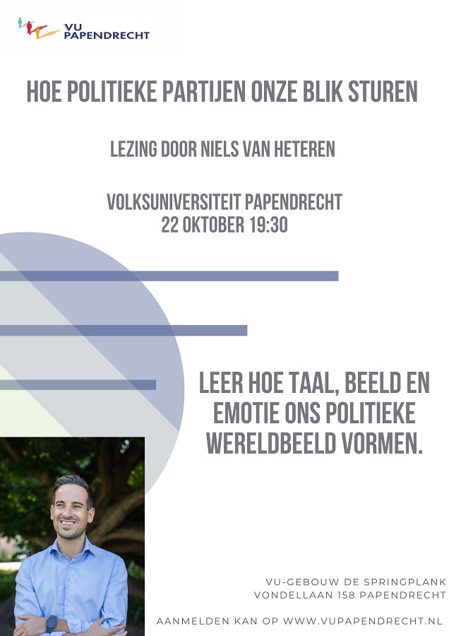 In aanloop naar de Tweede Kamerverkiezingen organiseert de Volksuniversiteit Papendrecht een lezing over framing, beeldvorming en de invloed van sociale media op het politieke debat. Op woensdag 22 oktober om 19.30 uur neemt Niels van Heteren het publiek mee in de wereld achter de politieke boodschap: hoe beïnvloeden partijen met woorden, beelden en algoritmes onze blik op de werkelijkheid?