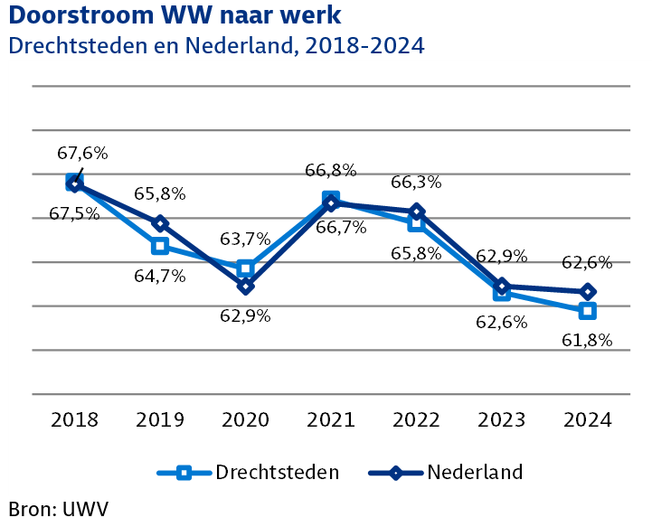 De uitstroom naar werk vanuit of kort na de WW-uitkering was de afgelopen vier jaar iets lager dan landelijk. Van de 3.390 inwoners in de Drechtsteden van wie de WW-uitkering in 2024 eindigde, stroomden 2.090 mensen door naar werk. Daarmee is in de Drechtsteden het doorstroompercentage naar werk 61,8%, wat iets lager is dan het landelijk gemiddelde van 62,6%. In de Drechtsteden nam in vergelijking met 2023 het aandeel werk in de WW-uitstroom licht af; in 2023 bedroeg het regionaal doorstroompercentage 62,6%. Landelijk deed zich ook een lichte afname van het aandeel werk voor.