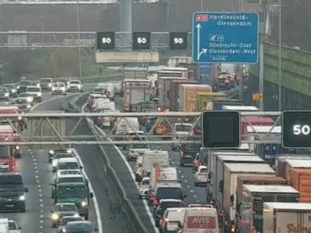 De rechterrijstrook was enige tijd afgesloten. De vertraging liep op tot een kleine anderhalf uur tussen knooppunt Ridderkerk en Hardinxveld-Giessendam.