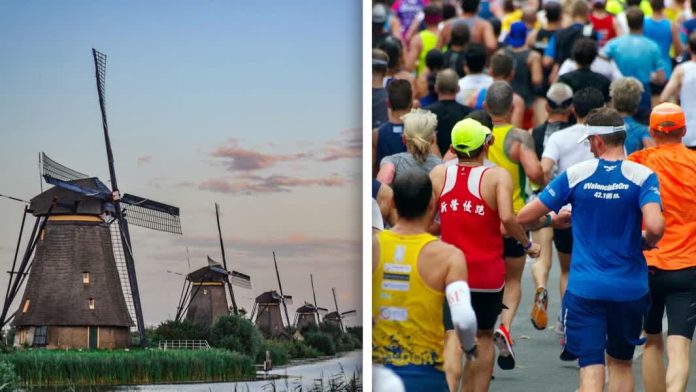 De molens in Kinderdijk en marathondeelnemers, foto's Rick Huijzer/Pixabay