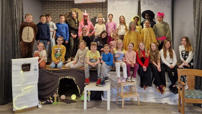 In kleine groepjes bouwden de kinderen decorstukken zoals bomen, een grot, een tijdmachine en een regenboog. Ook maakten zij kostuums van oude lakens en stoffen, bedachten dansjes en verzorgden hapjes voor het publiek.