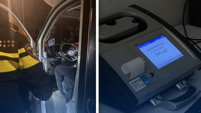 De 51-jarige man blies een G/F; de hoogst mogelijke uitslag bij zo’n test. Op het politiebureau bleek de man een alcoholgehalte van 800 ugl te hebben, en dat terwijl het in Nederland strafbaar is als je meer dan 220 ugl blaast. Het rijbewijs wordt bij ervaren bestuurders ingevorderd vanaf 570 ugl, maar ook die grens werd ruimschoots gepasseerd.