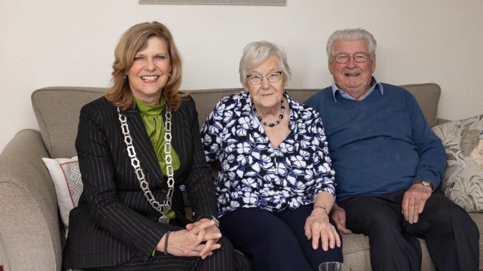 Afgelopen zaterdag ging burgemeester Margreet van Driel op bezoek bij het briljanten echtpaar Diemel-Alderliesten, dat die dag 65 jaar getrouwd was. De burgemeester bracht hun de felicitaties over namens de gemeente. Het echtpaar woont al 35 jaar in ons dorp.