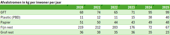 In de tabel hieronder staan de de ontwikkelingen per afvalstroom in de laatste 5 jaar. Aan de hoeveelheid restafval is duidelijk te zien dat de nieuwe manier van afval scheiden in 2024 is ingegaan.