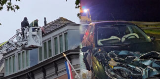Man zit op dak; auto duikt in vangrail