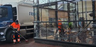 Afvalwagen beukt tegen fietsenwinkel station